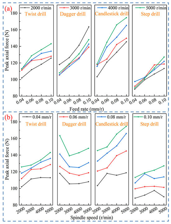 The peak axial force of CFRP interlaminar drilling is extracted under different tool structures and machining parameters, as shown in Figure 10. It can be observed that the peak axial force increases with the increase in feed rate, regardless of the tool structures used. Under certain spindle speed conditions (n = 2000 r/min), the peak axial force of the twist drill, dagger drill, candlestick drill, and step drill can increase by 23.51%, 38.45%, 40.76%, and 28.23%, respectively, when the feed rate increases from 0.04 mm/r to 0.10 mm/r, as can be seen in Figure 10a. This indicates that the axial force of the candlestick drill is most affected by the feed rate, while the axial force of the twist drill is the least.