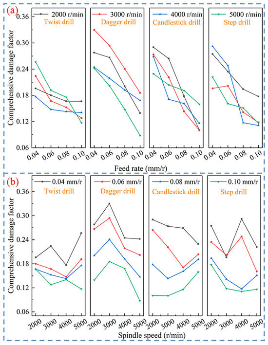 Figure 11 shows the comprehensive damage factor at the outlet with different tool structures and machining parameters. As shown in Figure 11a, regardless of the tool structures used, the comprehensive damage factor at the outlet is significantly reduced when the feed rate increases from 0.04 mm/r to 0.10 mm/r. Taking the spindle speed of 2000 r/min as an example, under the conditions of the twist drill, dagger drill, candlestick drill, and step drill, the comprehensive damage factors are reduced by 15.06%, 49.89%, 65.51%, and 35.39%, respectively. The fluctuation range of the outlet damage factor induced by the twist drill affected by the feed rate is smaller than that of the other three tools.