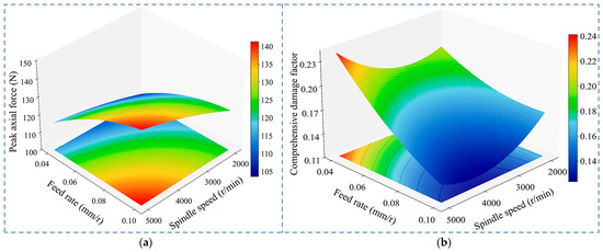 The 3D response surface diagram of CFRP interlaminar drilling: (a) peak axial force; (b) comprehensive damage factor.
