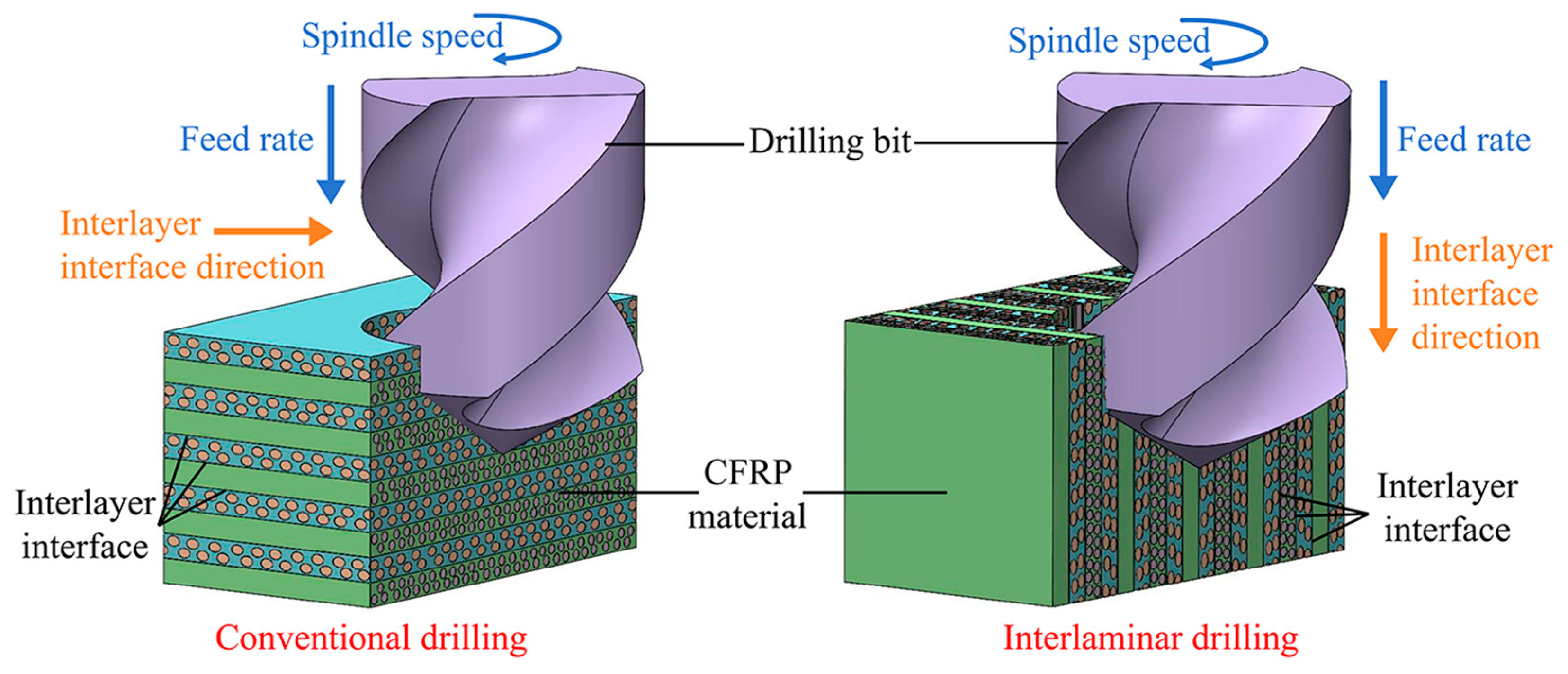 - Li, S.J.; Li, Q.Q.; Dai, L.Y.; Liang, W.Y.; Li, C.P.; Li, P.N.; Qiu, X.Y.; Ko, T.J. Formation mechanism of outlet damage in interlaminar drilling of CFRP. Int. J. Adv. Manuf. Technol. 2023, 129, 5117–5133. [Google Scholar] [CrossRef]