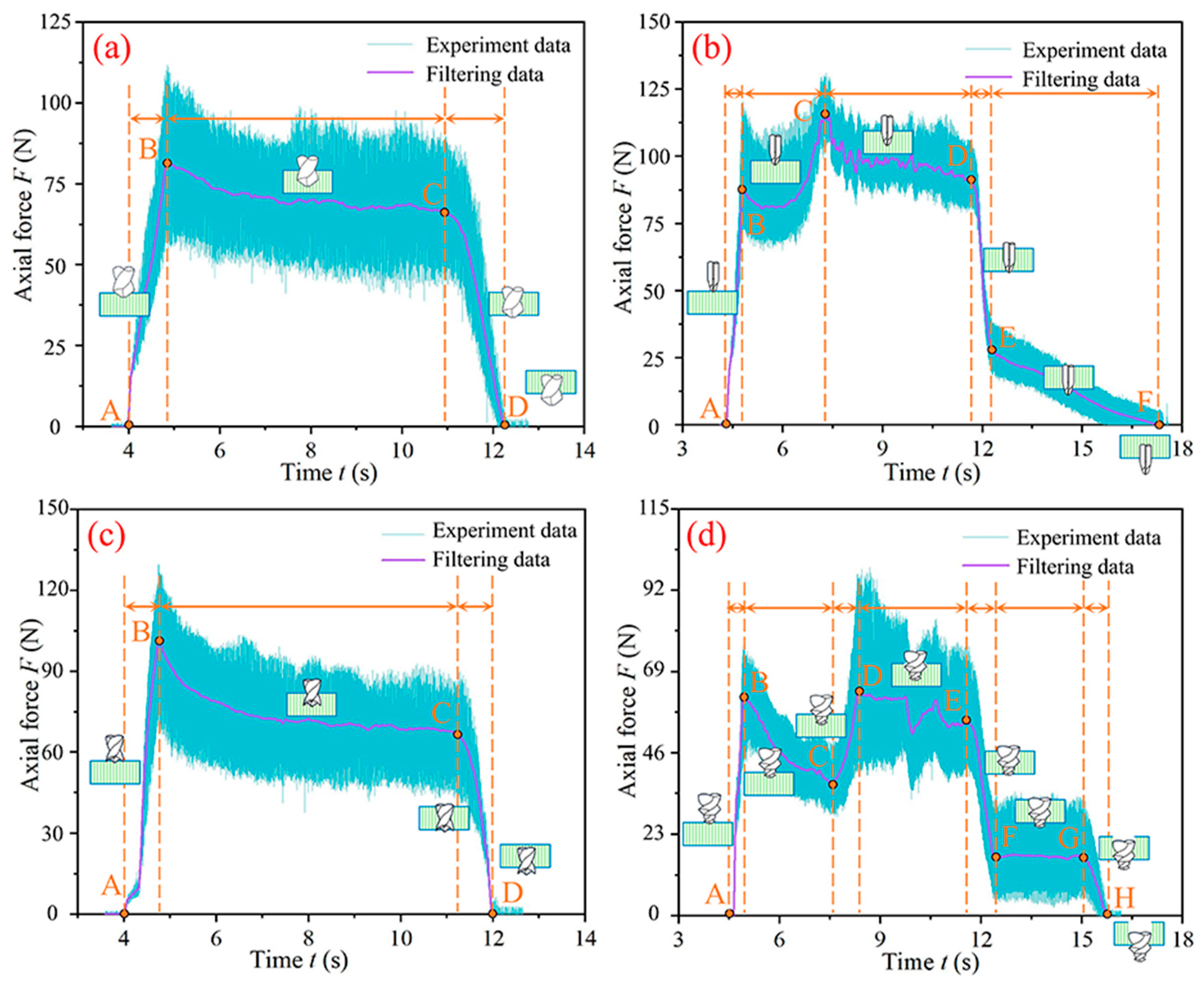 - During the interlaminar drilling process of CFRPs, the axial force time-varying response curve is highly susceptible to the geometric structure of the tool tip. Under the same machining condition (n = 2000 r/min, f = 0.06 mm/r), the peak axial forces of the four types of drills are in the order of dagger drill (126.45 N) > candlestick drill (120.93 N) > twist drill (111.83 N) > step drill (99.62 N).