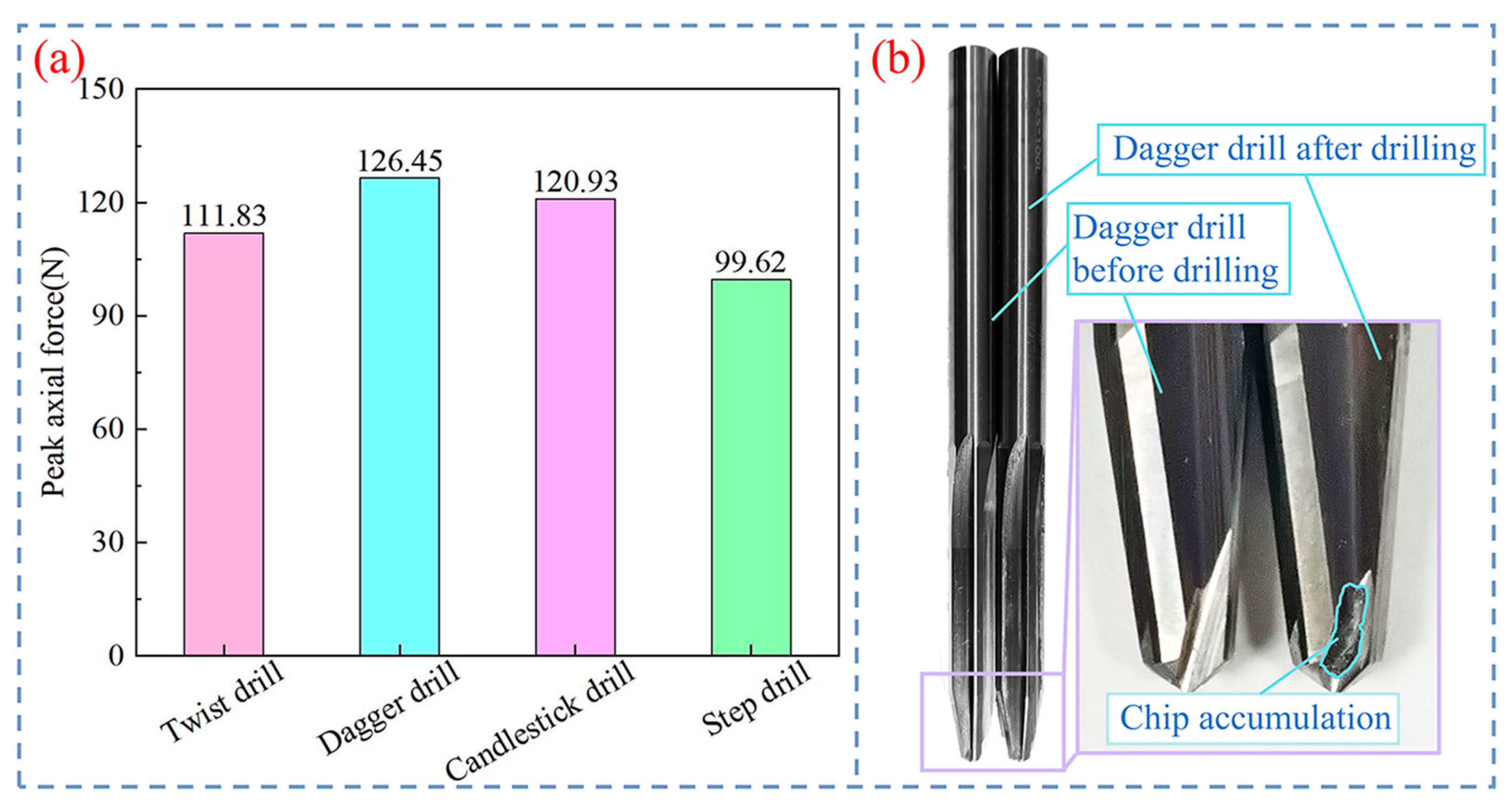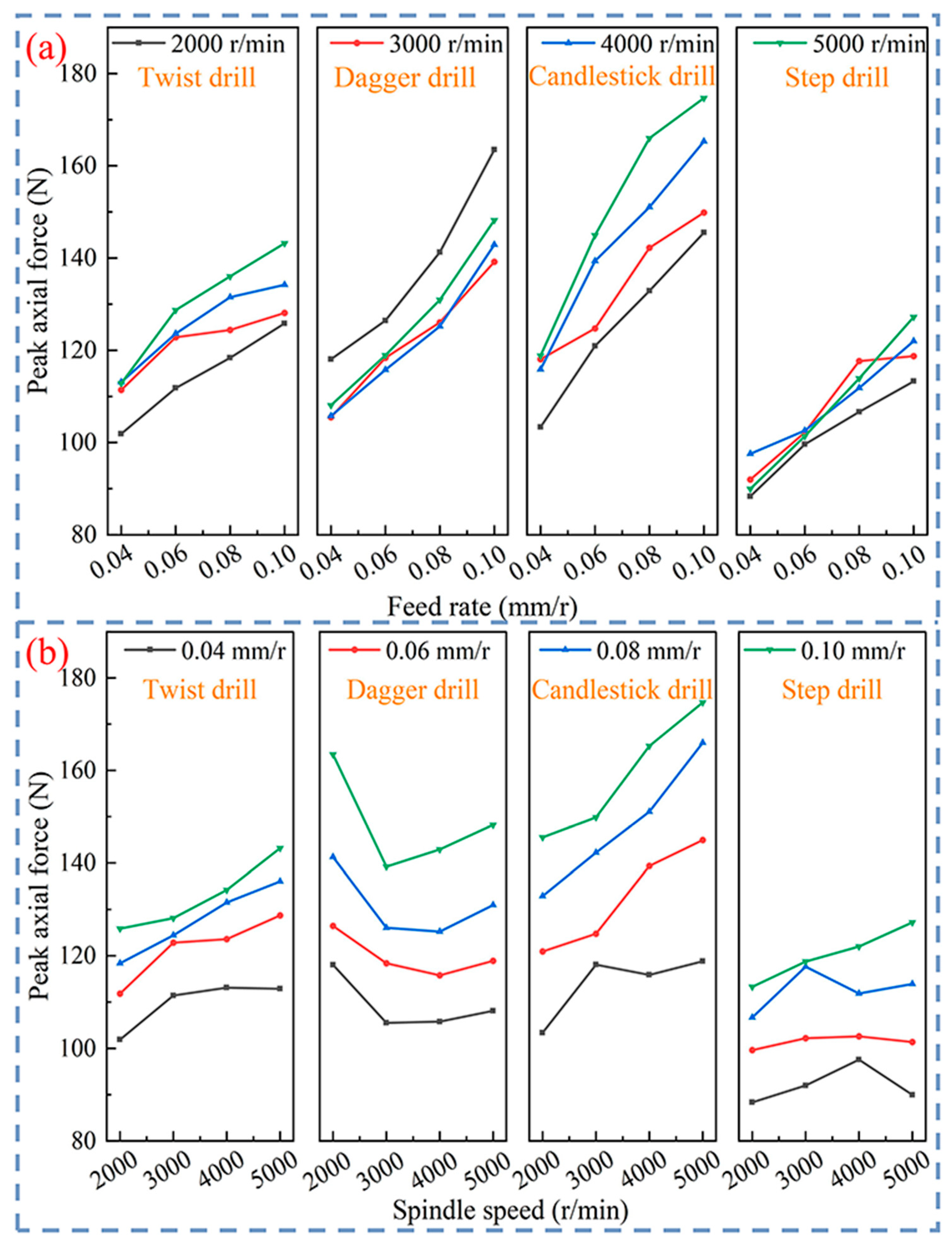- The axial force generated by the four different drills increases with the increase in feed rate. The candlestick drill is most affected by the feed rate, while the twist drill is the least. The peak axial force induced by the four different drills increases with the increase in spindle speed, but the dagger drill shows a trend of first decreasing and then increasing with the increase in spindle speed and reaches its minimum value at the spindle speed of 3000 r/min.