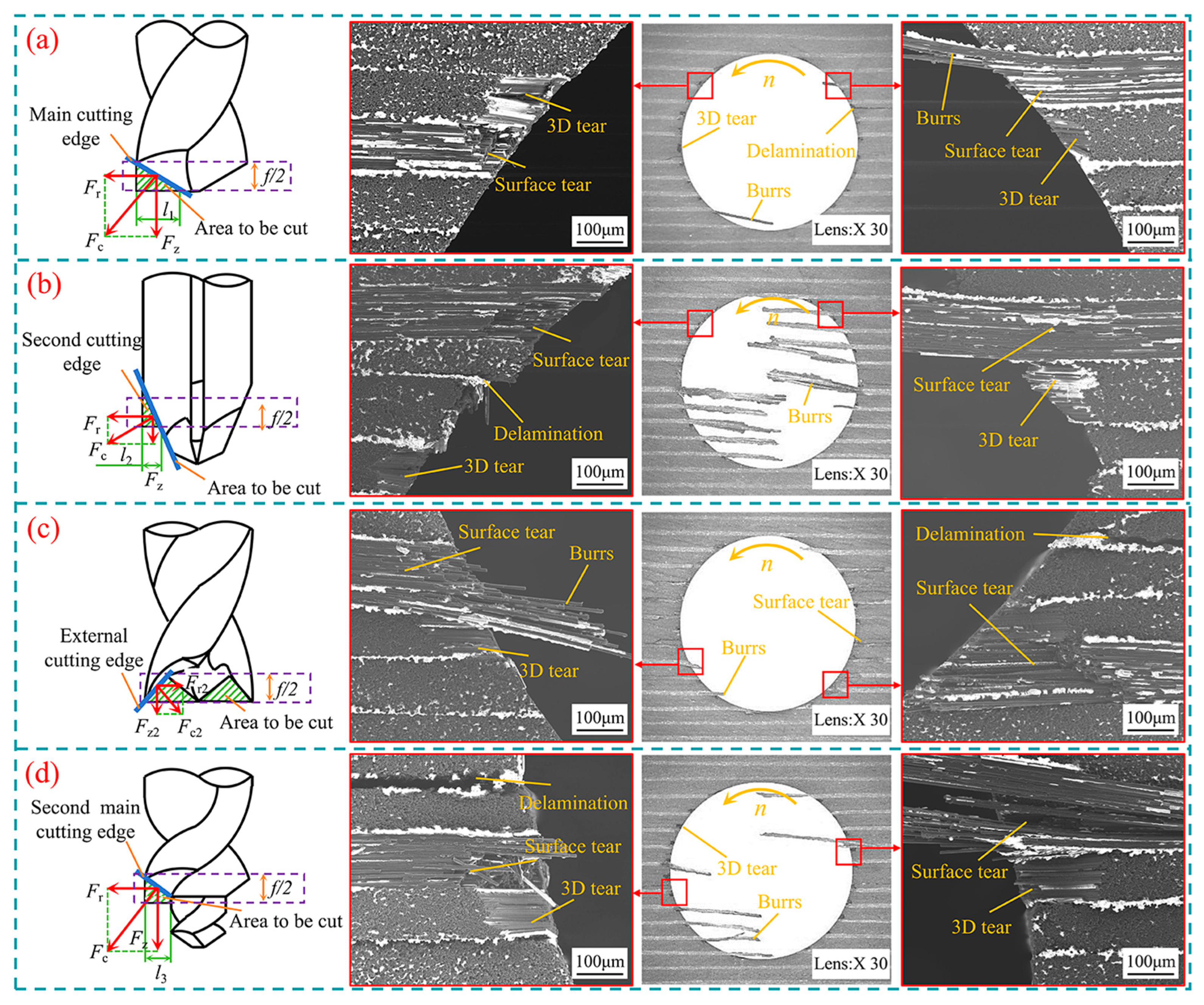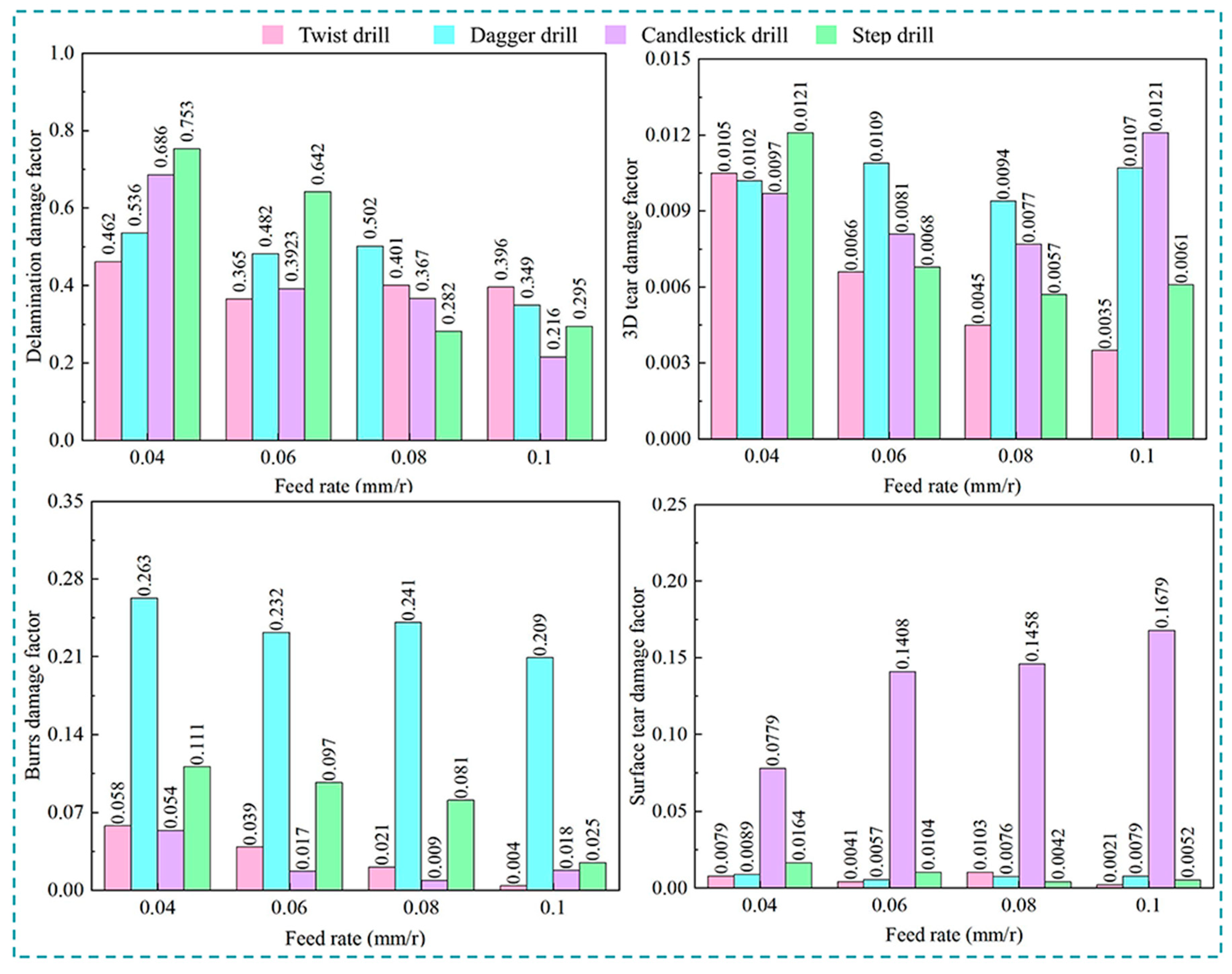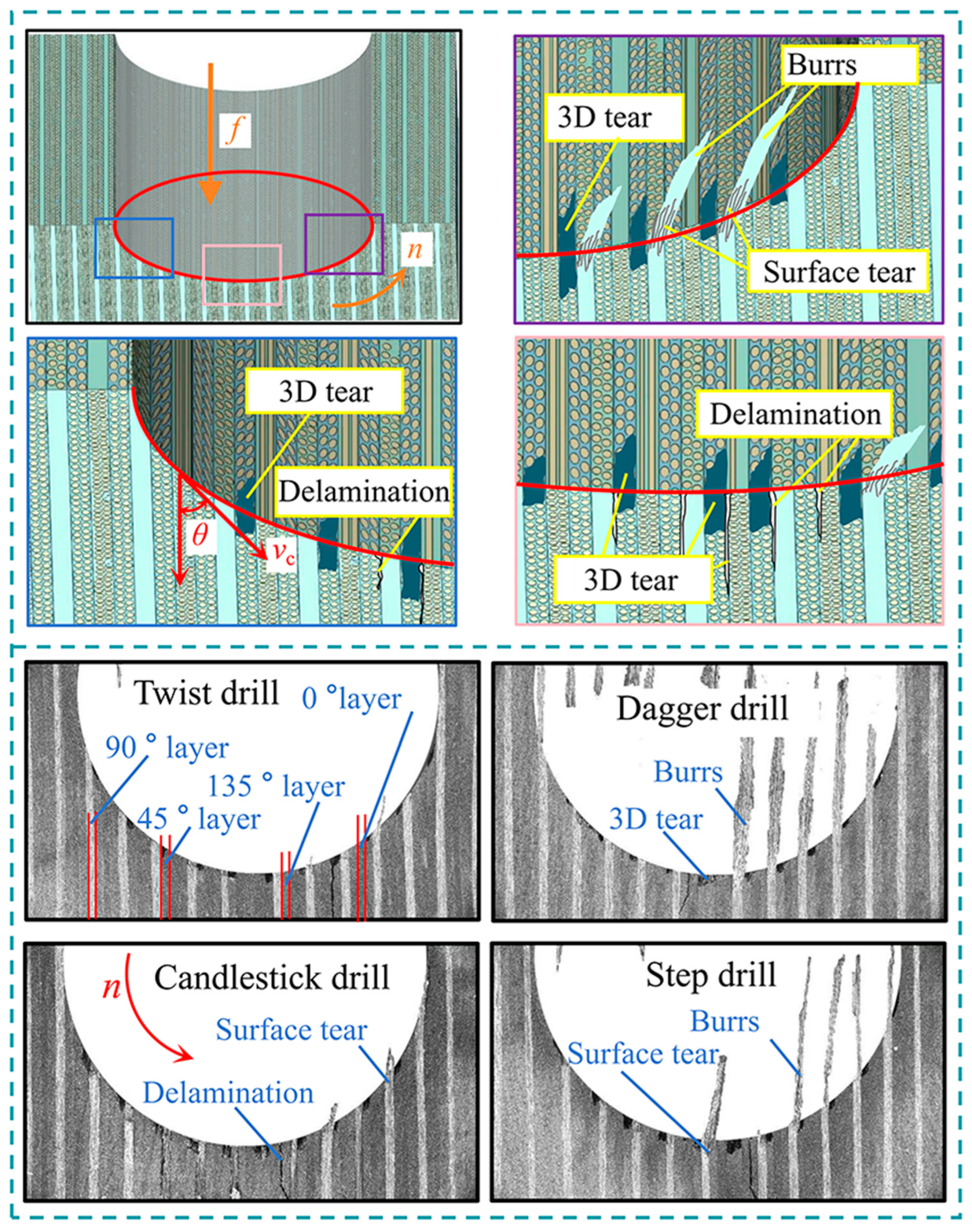 - Under the same machining condition, the types of damage produced by the dagger drill and candlestick drill are mainly burrs and large areas of surface tear damage, respectively. But the 3D tear damage produced by twist drills and step drills is more obvious.
