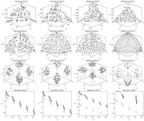 In this study, addressing high-dimensional optimization scenarios, four algorithms were employed to solve the DTLZ/ZDT series test functions [20,21] under identical algorithmic conditions. Specifically, the number of objective functions was set to M = 3, the decision variable dimension to D = 28, the population size to N = 200, and the maximum evaluation count to maxFE = 10,000. For ZDT3, the problem definition itself has the characteristic of M = 2, while in testing the decision variable dimension is elevated to D = 50, while other settings remain unchanged. The corresponding test functions are listed in Table 1.