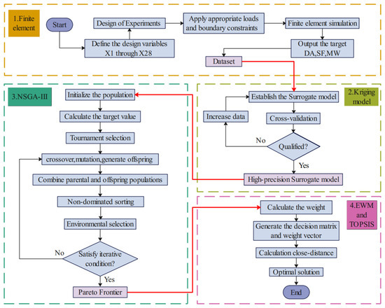 Extensive research has been conducted to optimize the mechanical properties of deck machinery. Vladimir Solovyov [5] analyzed the effects of drum dimensions, materials, and load-strain accumulation, proposing a barrel-shaped winch design capable of predicting plastic deformation. Haoran Ye et al. [6] optimized the mechanical properties of marine multi-layer winch drums through full-scale experiments. Jin C et al. [7] achieved winch lightweighting and economic efficiency enhancement using multi-objective genetic algorithm (MOGA) optimization algorithms. Concurrently, to address the high costs associated with experiments and simulations, surrogate models have been introduced to establish global performance prediction mechanisms, potentially improving optimization efficiency. Xiaoyu Huang et al. [8] proposed a genetic algorithm based on adaptive Kriging and validated its effectiveness in the engineering application of aircraft engine turbine disks. Rohit Kumar et al. [9] employed stochastic Kriging to simulate semi-submersible floating offshore wind turbine (FOWT) mooring cable tension. Zhou Jiang et al. [10] proposed a multi-objective optimization method based on computational fluid dynamics-artificial neural network-non-dominated sorting genetic algorithm II (CFD-ANN-NSGA-II) for efficient structural parameter optimization of stirred reactors. Feng Liu et al. [11] combined an improved Kriging model with improved non-dominated sorting genetic algorithm II (INSGA-II) to minimize the direct navigation drag and diving drag of autonomous underwater vehicles (AUVs). Ji Lin et al. [12] introduced a dual-risk archiving strategy to enhance the optimization performance of costly multi-objective problems.