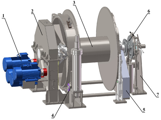 Engineering model of the electric towing winch. 1—Motor, 2—Reducer, 3—Main drum, 4—Brake, 5—Middle frame, 6—Anchor chain wheel, 7—Wall frame.