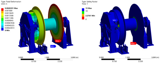 Based on the above analysis, the model can be preprocessed, loaded, and analyzed to determine the maximum deformation, minimum safety factor, and their relative positions. The results are shown in Figure 4.