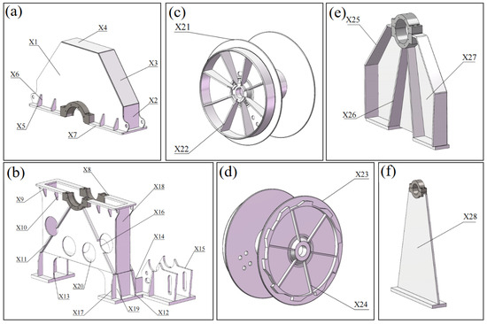 Initially, the towing winch structure was decomposed into four core subsystems: the reduction gearbox, intermediate frame, wall frame, and main drum. Within each subsystem, all theoretically variable dimensional parameters were identified based on parametric models. Subsequently, sensitivity-assisted analysis was employed to select 28 critical dimensional parameters, as illustrated in Figure 5. The upper limit of the design variables was set at 130% of the initial dimension, while the lower limit was set at 70% of the initial dimension, as detailed in Table 4.