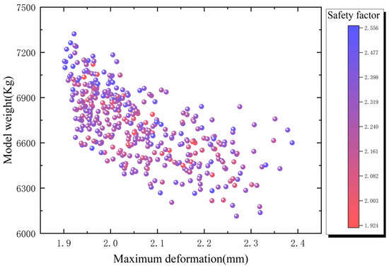 To ensure the predictive accuracy of the subsequent surrogate model, 400 uniform samples were generated within the parameter space using Latin Hypercube Design (LHD) [29], based on the permissible upper and lower limits of the aforementioned 28 variables. Design of Experiments (DoE) were conducted based on these 400 experimental plans, with the results shown in Figure 6.
