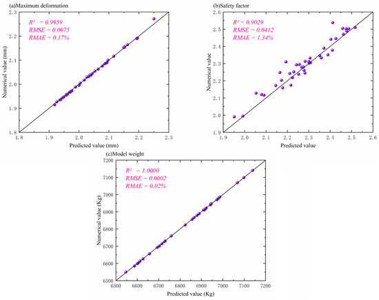 The comparison between numerical values and predicted values: (a) Maximum deformation, (b) Minimum safety factor, (c) Model weight.