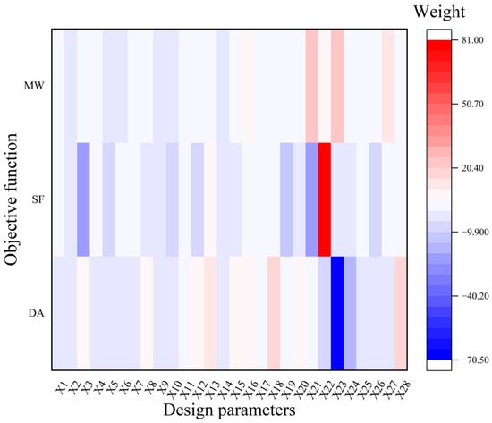 The sensitivity analysis diagram clearly shows that design variables X24 and X27 have the most significant impact on the maximum deformation (DA), with the highest sensitivity, while X3 and X26 play a dominant role in the safety factor (SF), making them key factors in determining safety performance. In terms of weight (MW), X27 and X28 make the most significant contributions, with particularly noticeable effects.