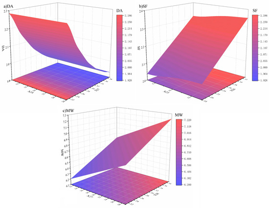 Three-dimensional response surface characteristics: (a) Response graphs of X28 and X23 to DA, (b) Response graphs of X3 and X22 to SF, (c) Response graphs of X21 and X23 to MW.