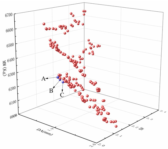Based on the multi-objective optimization model described above, the NSGA-III algorithm was employed to generate solutions. The initial population size was set to 200, with a maximum iteration limit of 1000. The resulting Pareto front is illustrated in Figure 10.