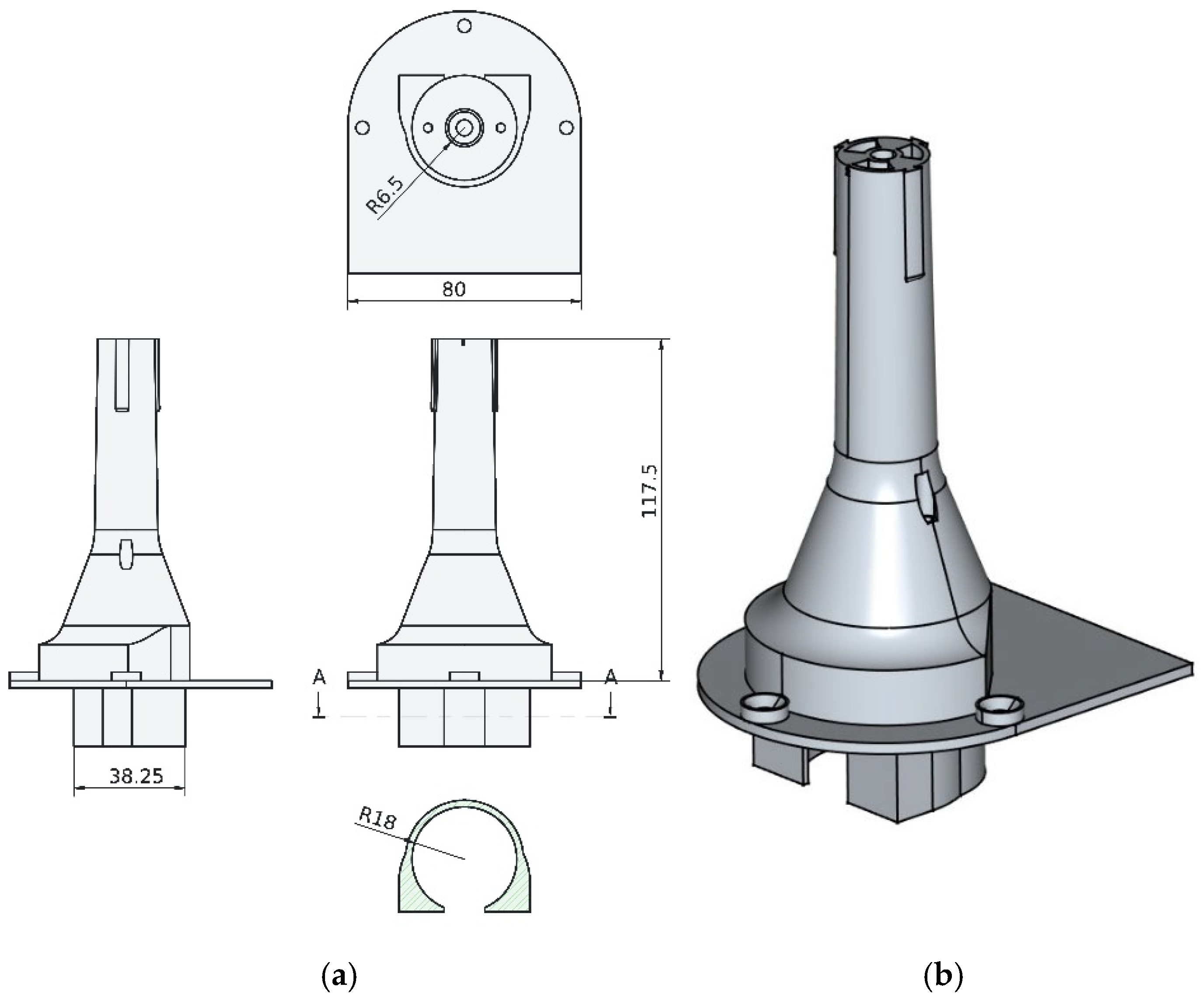 Figure 5. The height is set at 117.5 mm with an outer diameter of 13 mm. The tower segment mounting mechanism is located at the top, where the internal path of the quarter-turn hole and the external rail for the connecting ring can be identified. The tower base therefore features an adjustable system that allows it to be attached to different test stands, such as floating platforms or onshore wind energy benches. The top section features a connection system to other segments to modify the overall tower height.