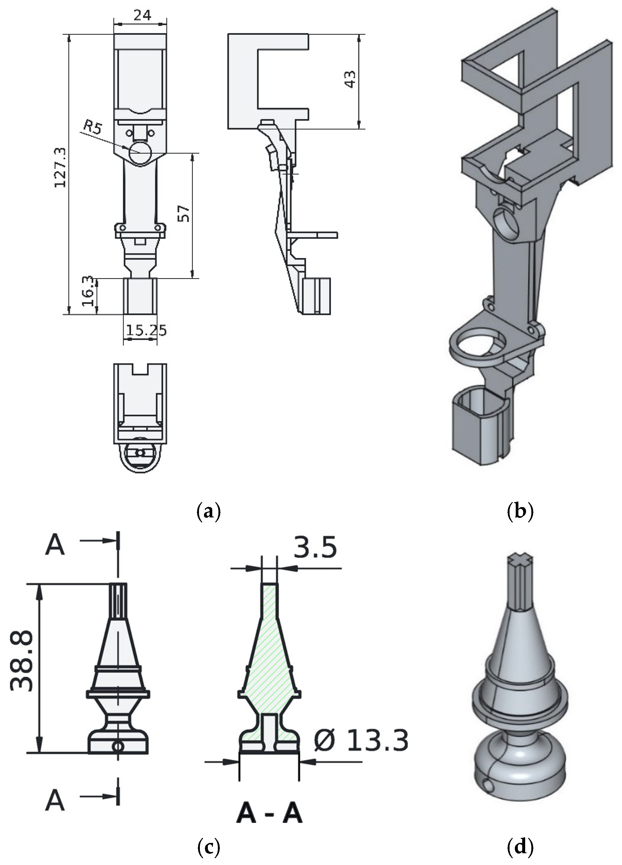 Indeed, PLA has proven to be an ideal material for the initial phase of prototyping, thanks to its easy and stable printing, as it does not warp upon cooling, allowing for highly detailed parts with good surface finishes from the first attempt. Its low cost and biodegradability make it suitable for rapid iteration in research environments. However, it has some mechanical limitations, such as fragility and low impact resistance, which can lead to cracking under sudden stress or continuous tension. It also has low thermal resistance (softening around 60 °C). Nevertheless, under the operating conditions of this study and the proposed future research, these conditions, which might deform the model, are not expected to occur.
