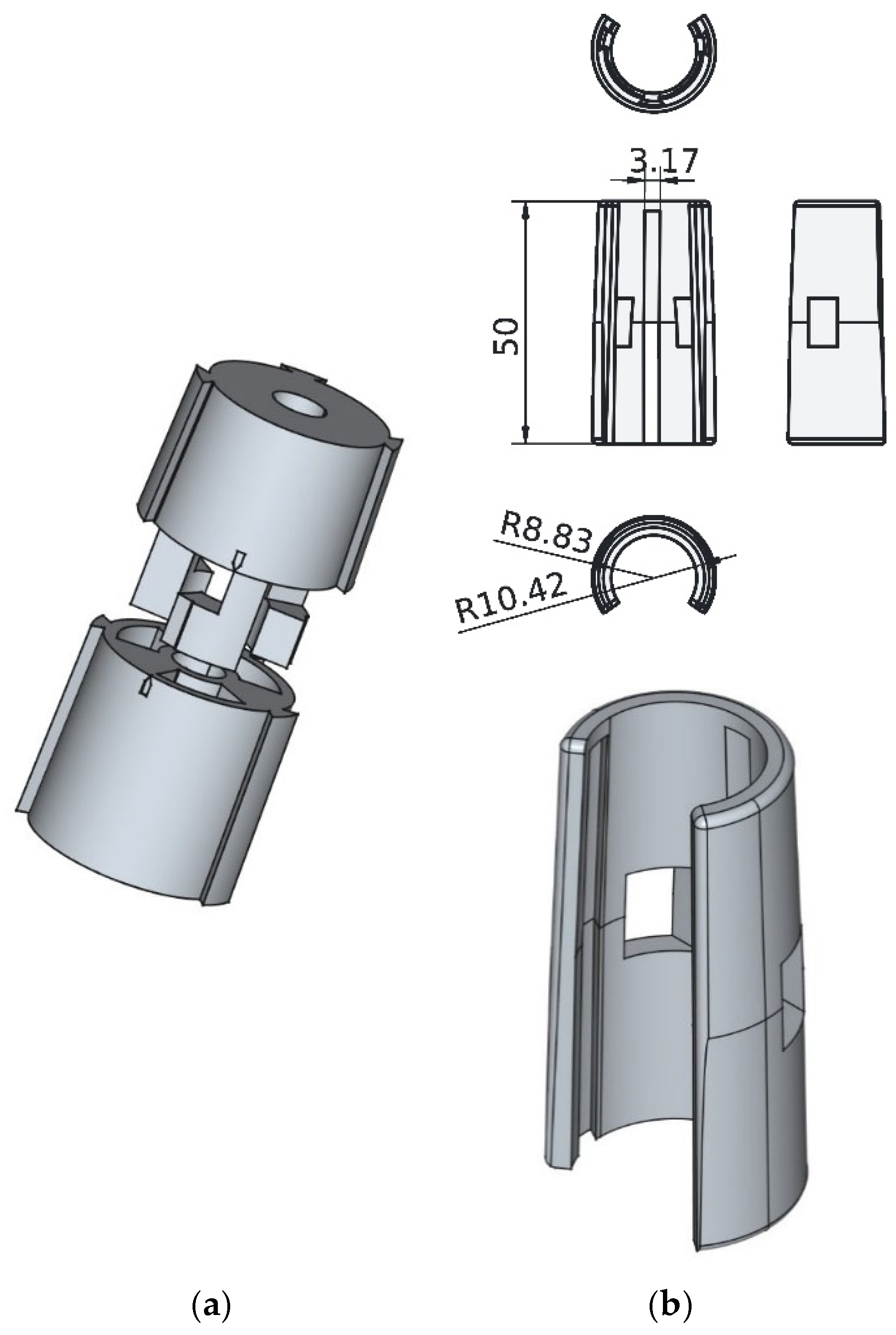 Figure 8a,b. This module was designed to attach a generic 5 V DC motor to the top of the tower and connect to the mechanical transmission module that supports the rotating parts of the wind turbine. Additionally, a top bracket was included to locate and attach a servomotor used to control the blade pitch angle. The gearbox and generator are coupled by a 3D-printed shaft (
