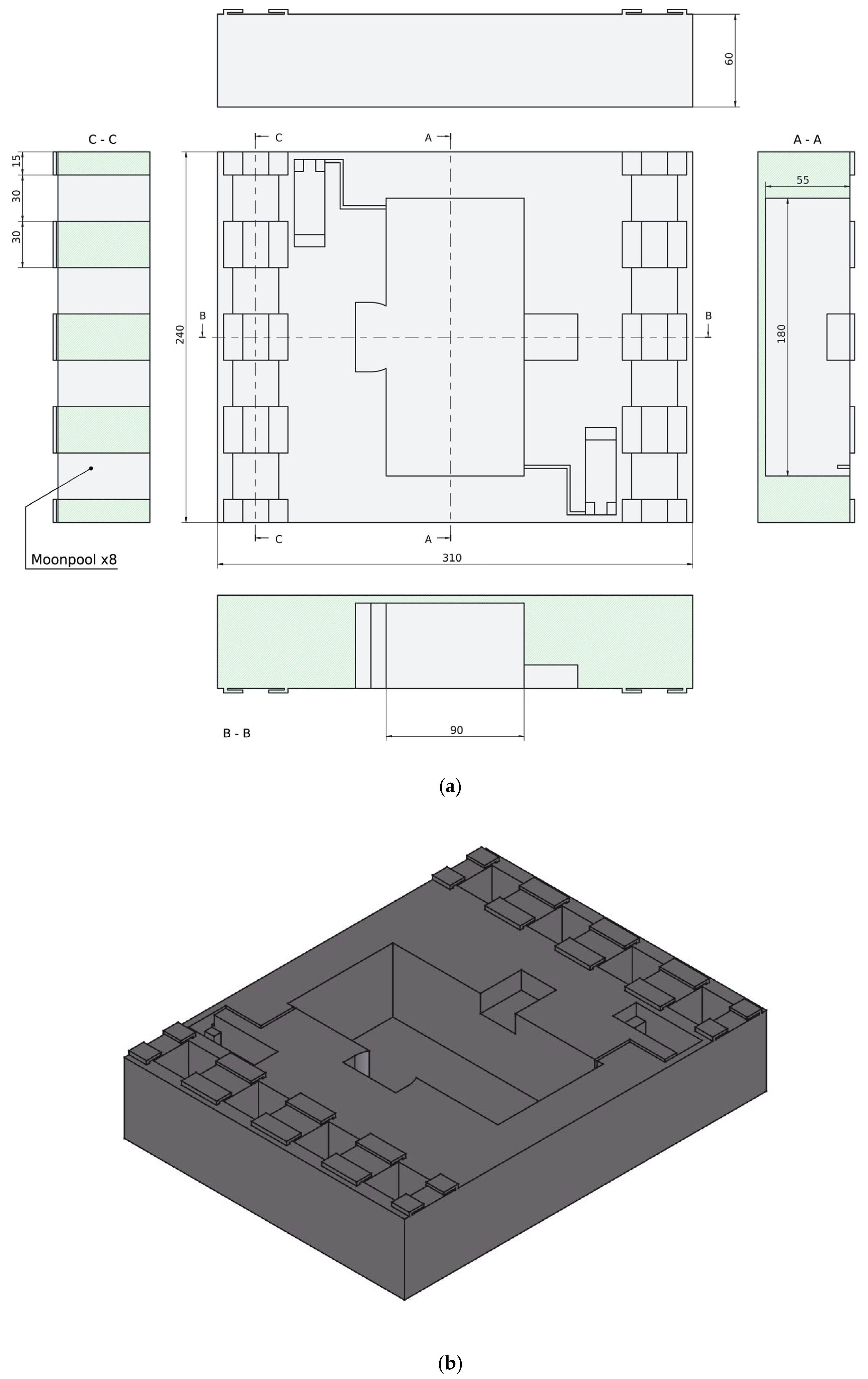 It has eight 30 mm long square moonpools or hollows, evenly distributed at the front and rear. These hollows are designed to regulate wave-induced forces, thereby reducing wave thrust on the structure and contributing to the platform’s overall stability. While the hydrodynamics of a platform with these hollow sections is a complex problem requiring specific analysis, previous studies have shown that they can effectively mitigate wave-induced motions on floating structures [