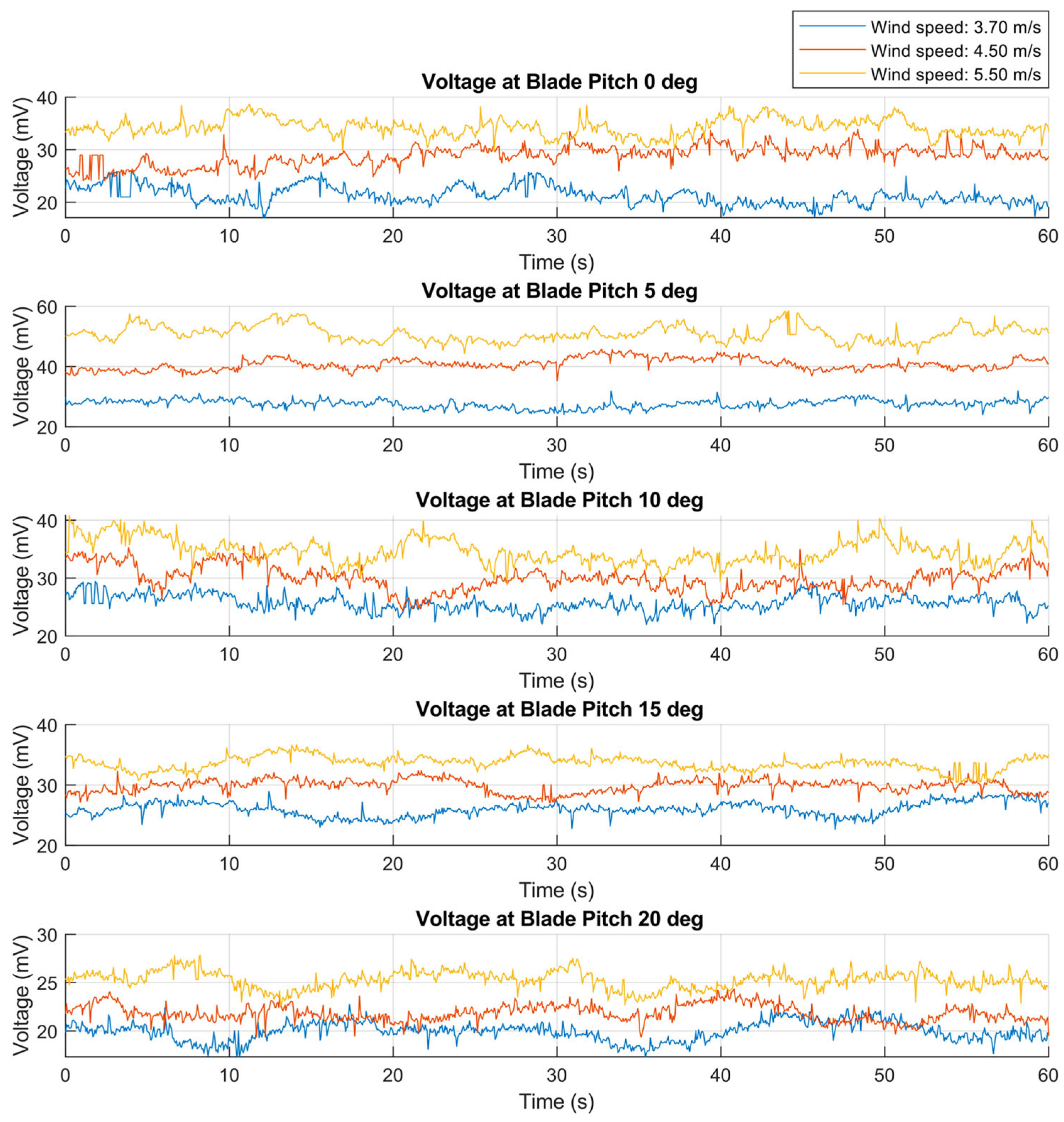 Figure 13 and following corresponds to wind speeds of 3.70 m/s (blue line), 4.50 m/s (red line), and 5.50 m/s (orange line) for pitch angles of 0, 5, 10, 15, and 20 degrees (from top to bottom). The average value of each signal is presented in