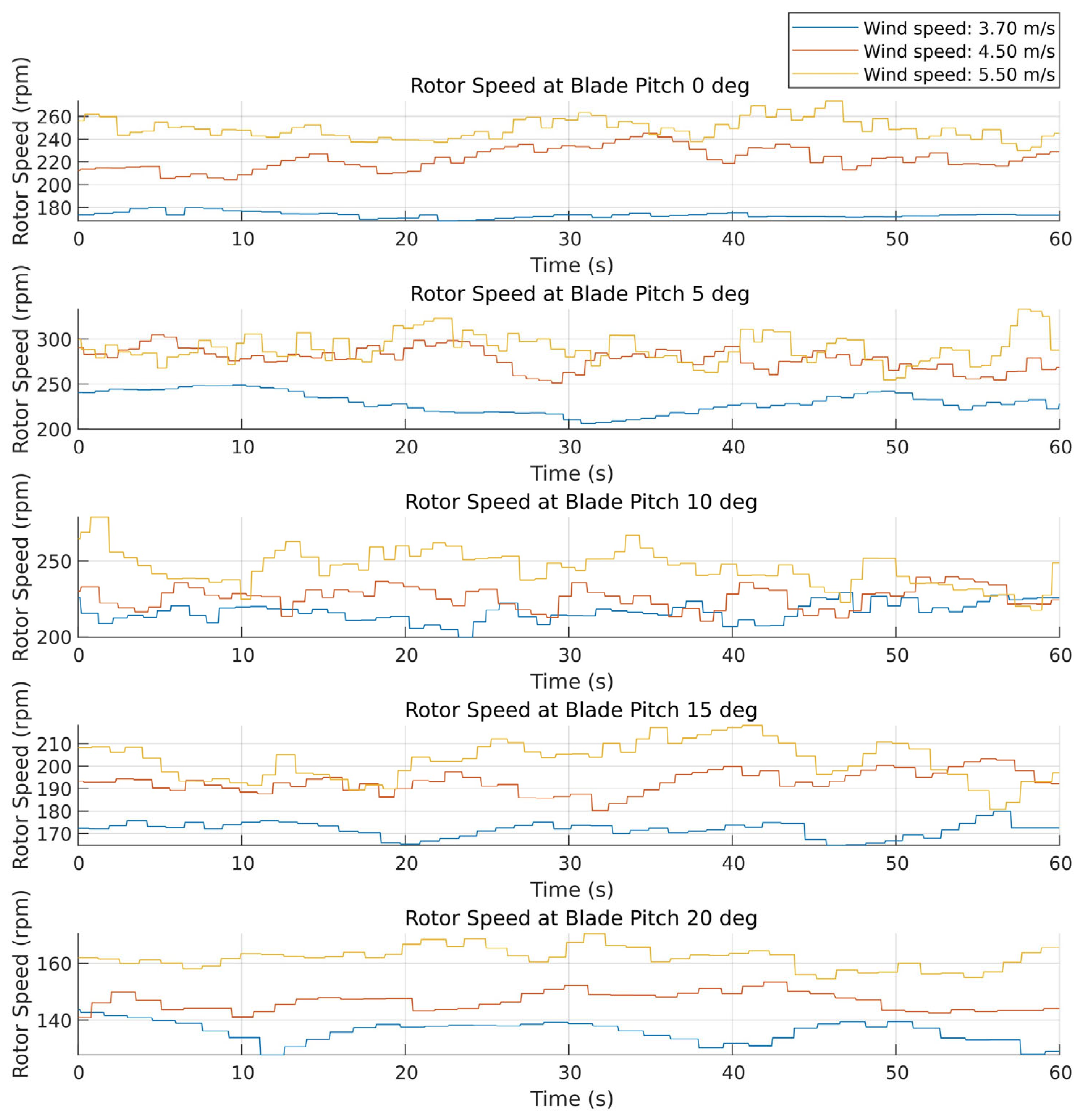 Figure 14 shows the rotor speed for the same wind speed and pitch angle scenarios (the average speeds are presented in