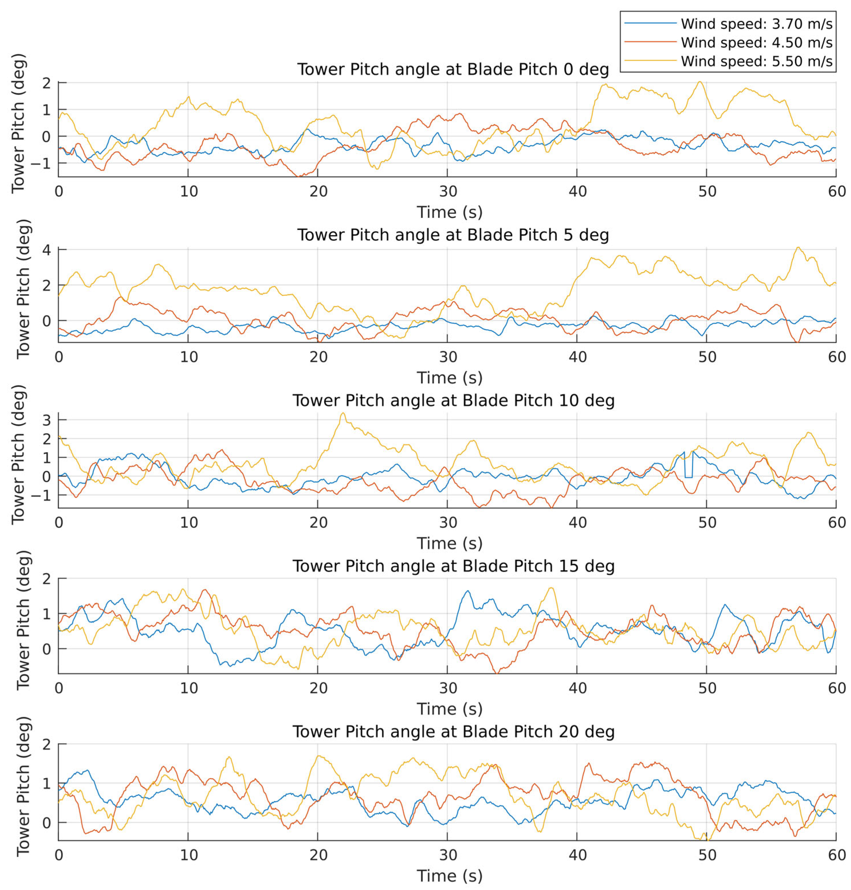 Figure 15 represents this angle (°) under different wind conditions. They are quite similar for all experiments with different blade pitches. The value of this metric has an average amplitude of approximately 0.5°, reaching a maximum of 4° when the rotor operates at maximum speed, a condition in which the system experiences significant dynamic behavior.
