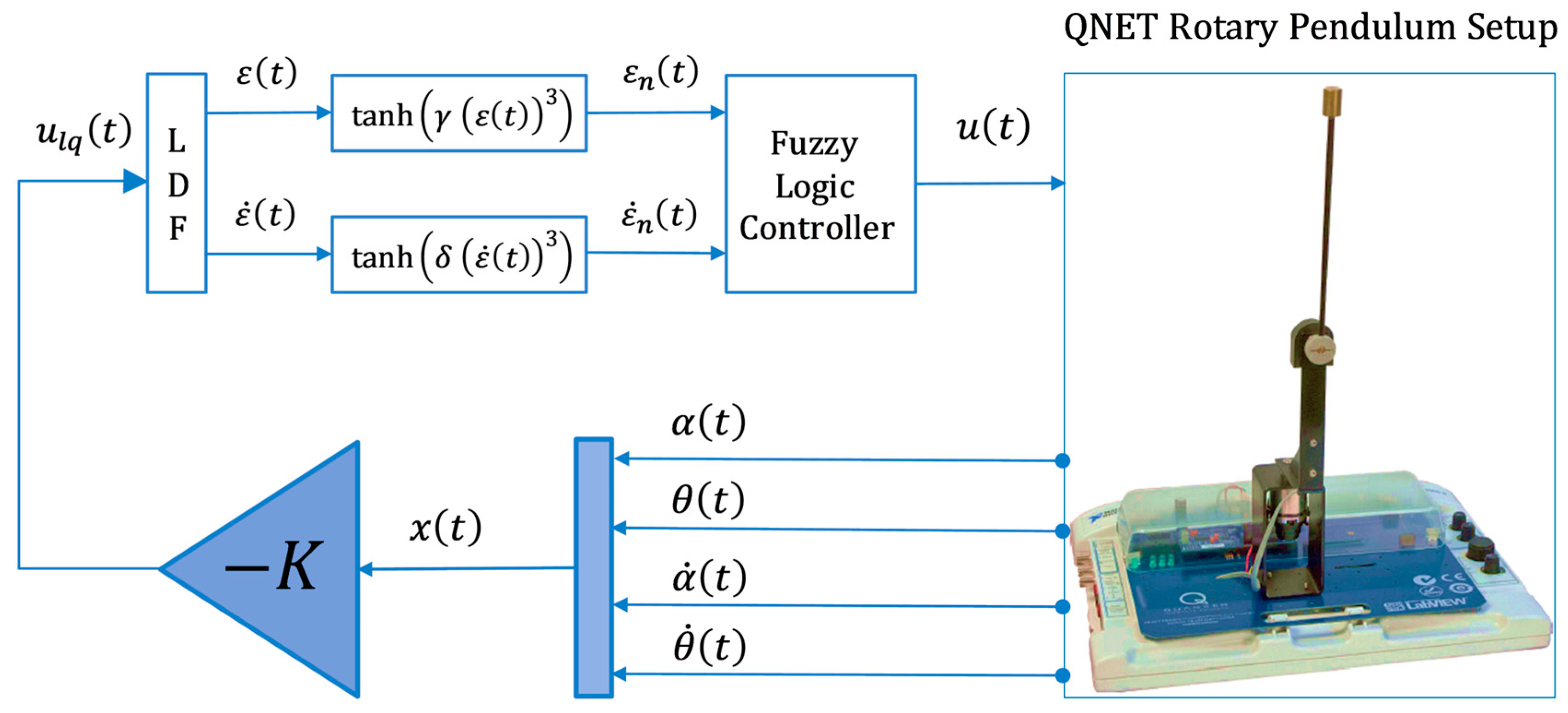 - Hazem, B.Z.; Fotuhi, M.J.; Bingül, Z. Development of a Fuzzy-LQR and Fuzzy-LQG stability control for a double link rotary inverted pendulum. J. Frankl. Inst. 2020, 357, 10529–10556. [Google Scholar] [CrossRef]