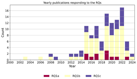In terms of response to subquestions of RQ1: 10 publications were found to respond to RQ1a, 61 were found to respond to RQ1b and 39 were found to respond to RQ1c. Some publications respond to more than one of the subquestions of RQ1.