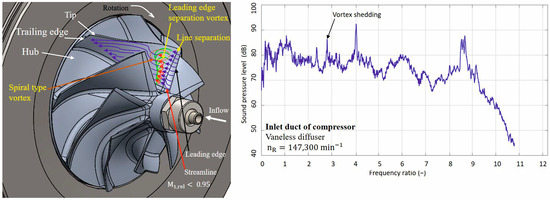 As the separated stream moves further, momentum is transferred between the separated stream and the main stream. The transfer of momentum between the stream generates a vortex in the region of the stream with low momentum. The generated vortex expands and is included in the mainstream. Hence, the phenomena is characterized by a time period, and another low-momentum region is created at the location of the blade’s leading edge. If a certain intensity of velocity gradients in the shear layer is reached in the region with low momentum, a new vortex is created. In the case of the mentioned instabilities, it is assumed to occur in the area of the impeller, in the area of the inlet and outlet of the impeller, and in the area of the diffuser and vaneless diffuser. Equation (3) can be used to determine the excitation frequency of the phenomena. In the case of the rotation speed line with the lowest value of the compressor speed, the noise was observed at 2× the rotation frequency of the rotor [24].