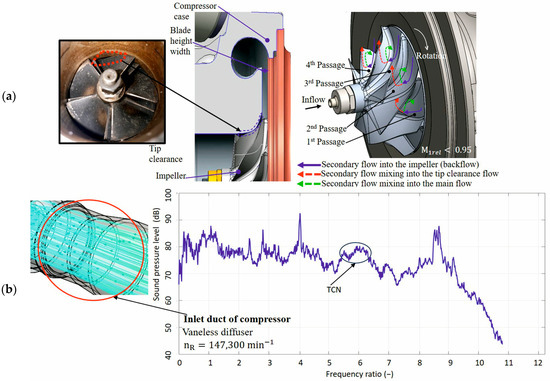 View showing (a) a centrifugal turbocharger compressor with marked parameters defining the relative clearance of the tip and (b) the assumed direction of the secondary flow in the impeller during the operation of the compressor at the occurrence of TCN with the assumed identification in the frequency spectrum.