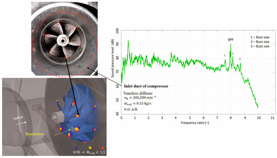 A view showing the expected formation of shock waves in the area of the inlet leading edges of the blades at supersonic flow velocities in the impeller during compressor operation in the case of a buzz-saw based on [31] and an example of the identification of a noise source in the frequency spectrum.
