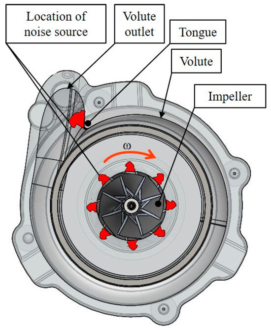 View showing the assumed locations of the BPF noise source in the centrifugal compressor casing, based on [38].