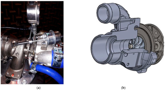 Nowadays, turbochargers are used for supercharging internal combustion engines, an approach which has also found application in the field of supercharging marine engines, stationary engines, etc. At the same time, the requirements for increasing the performance parameters of small-volume engines and the related requirements for increasing the supplied mass flow of compressed air and increasing the value of the relative compression by the turbocharger [1] are constantly increasing. The turbocharger basically consists of a compressor and a turbine connected along a common shaft [2,3]. The exhaust gases from the engine are directed through the turbine inlet casing to the turbine blades and subsequently released into the atmosphere through the turbine outlet casing [3,4]. The exhaust gas is used in the turbine to drive a compressor that compresses the air going into the engine’s turbocharger to supply the engine’s cylinders with air of a higher density than in the case of a naturally aspirated engine [4,5]. The combination of a single-stage centrifugal compressor and a single-stage axial or radial flow turbine is almost universally used in turbochargers [6,7].