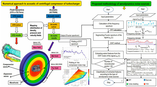 The methodology assumed the processing of the acoustic pressure signal necessary for the functionality of the proposed algorithm. Further development of the methodology resulted in the connection of the proposed algorithm and the numerical simulation of compressor aeroacoustics. Examples of identifying aerodynamic noise sources in FFT spectra were determined. Another result of the identification was the compressor map with a specified compressor noise map. The compressor map with the noise map and FFT spectra were created as outputs from the identification methodology.