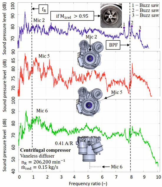 Based on the findings stated in the studies of Lee et al. [21], Sharma et al. [22], and Broatch et al. [23], the occurrence of broadband sound appears to occur during compressor operation near the surge limit. In summary, most researchers detected broadband noise near the 1–3 kHz band, which they attributed to operation near surge and backflow related to blade stalling.