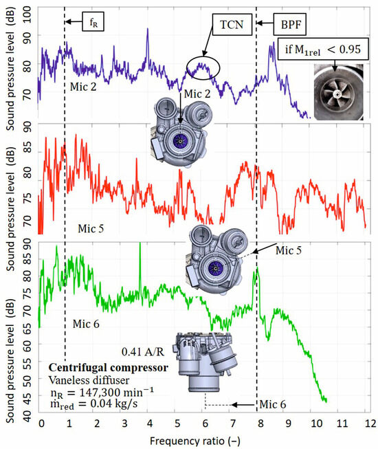 The estimated aerodynamic source can be called the buzz-saw. In the case of TCN source identification, the same procedure can be used. The first condition was related to the value of the relative Mach number of the working medium in the inducer of the impeller, which was not met, i.e., M1rel < 0.95. The second condition was not met, because it was not possible to clearly determine the area suitable for assignment in the spectrum narrowband sound. The last verified aerodynamic source of the centrifugal compressor, mentioned in Section 2.1, was created in the case of meeting the condition of the relative Mach number of the working medium in the inducer of the impeller. The condition assumed the character of non-fulfillment if the relative Mach number of the inducer of the impeller M1rel > 0.95 was reached. When meeting the first condition, a source could be identified in the spectrum below the value of 4.