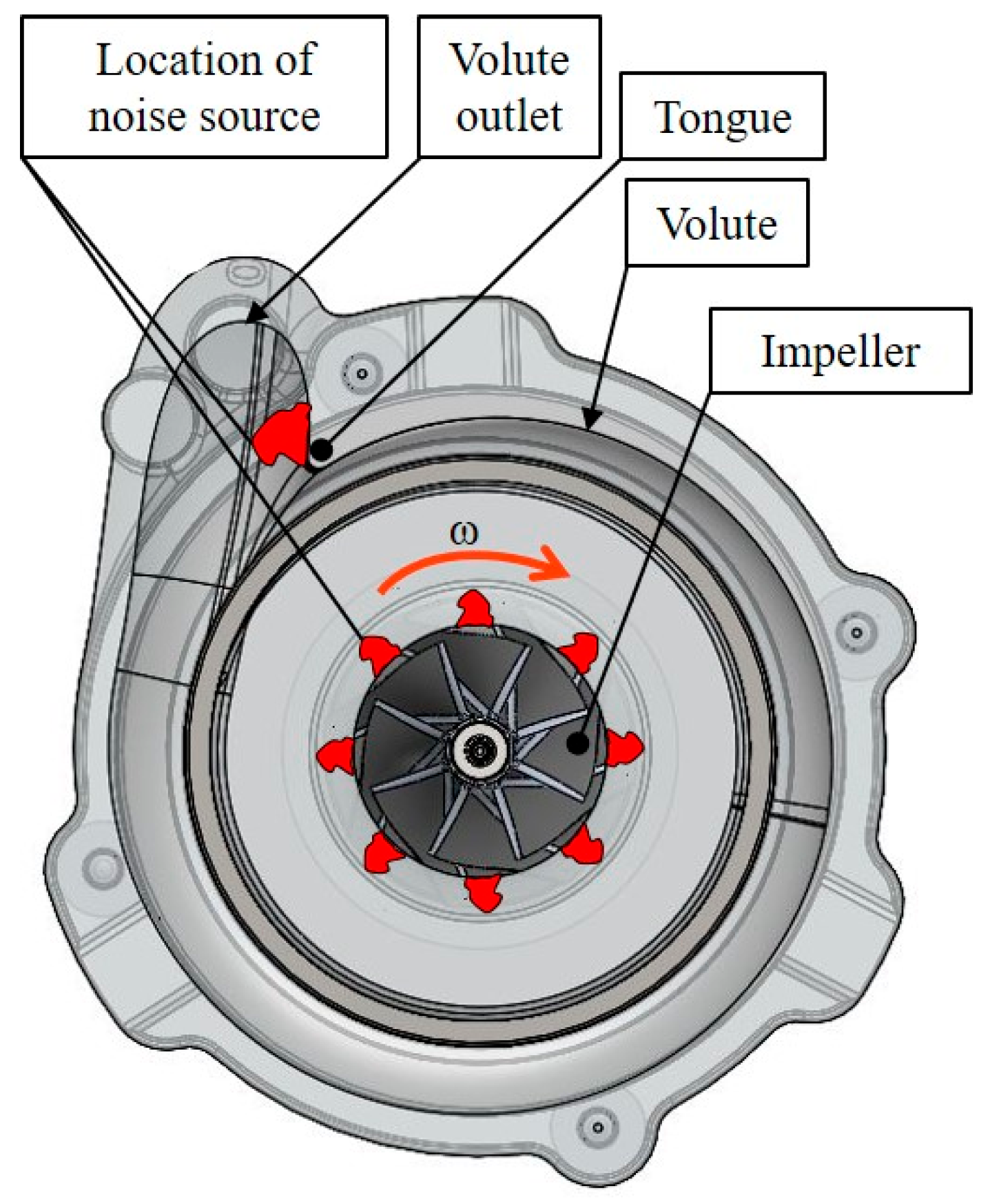 fBPF. Similarly, as with aerodynamic phenomena, it is necessary to determine the excitation frequency. The excitation frequency is defined by Equation (2). The supposed places where the noise source originates in the spiral casing of the compressor is shown in