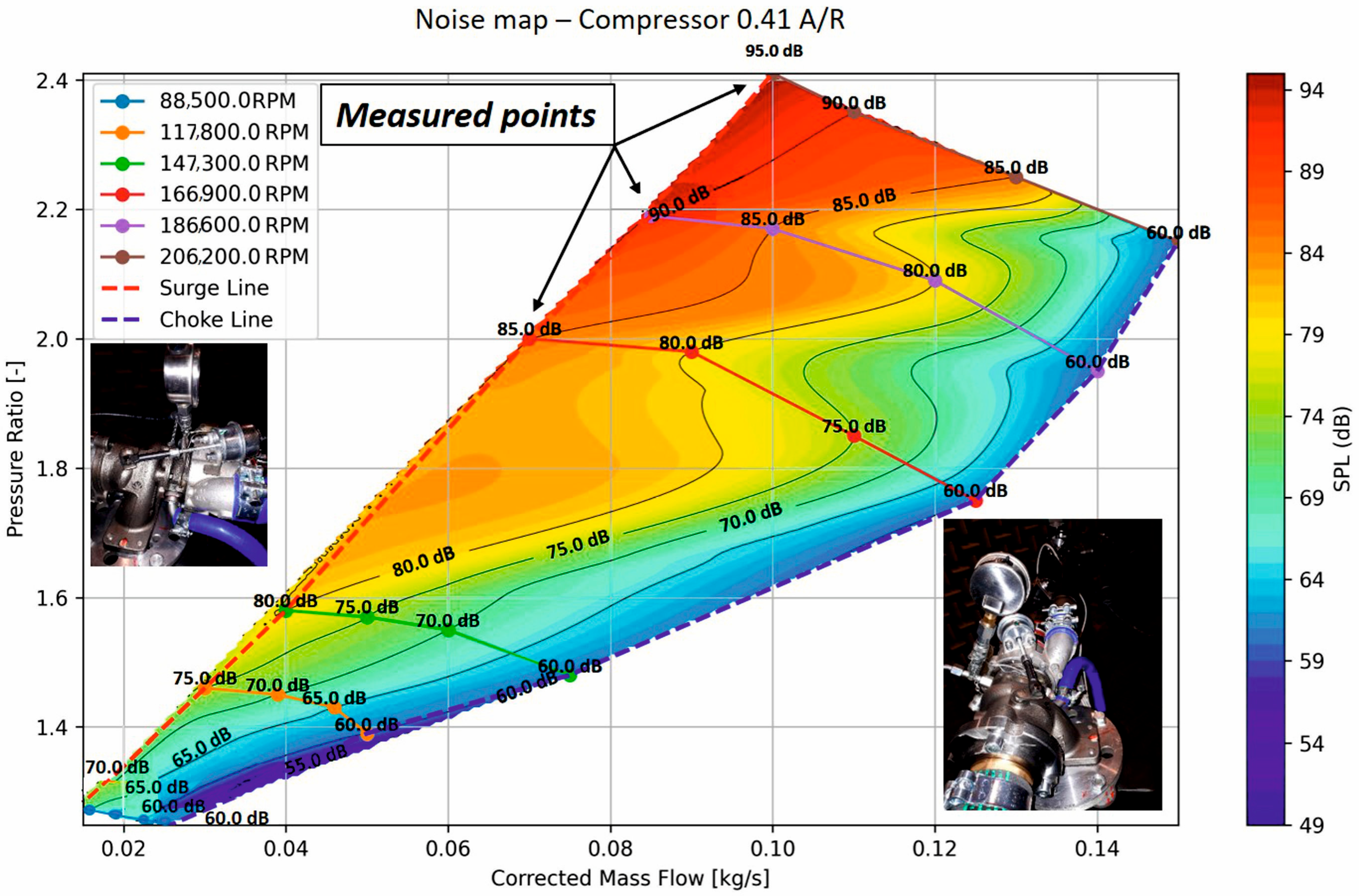 23], the occurrence of broadband sound appears to occur during compressor operation near the surge limit. In summary, most researchers detected broadband noise near the 1–3 kHz band, which they attributed to operation near surge and backflow related to blade stalling.