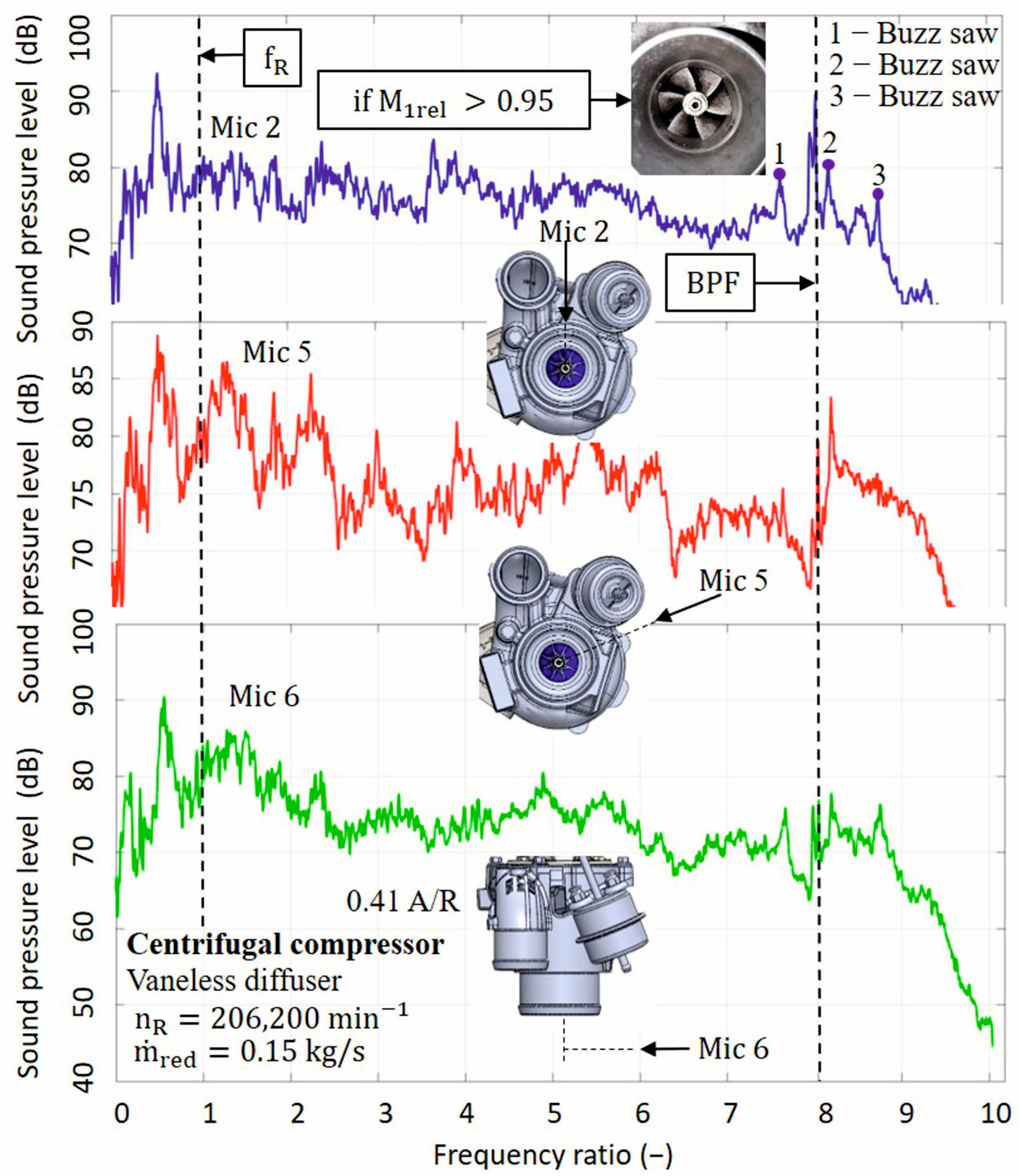 32] conducted research on this subject. Low-speed operation corresponded to subsonic conditions dominated by TCN as a narrowband sound. A narrowband sound was identified at approximately half the BPF. At higher operating speeds corresponding to transonic conditions, the spectrum was dominated by buzz-saw tones and BPF. Under specific operation conditions, shock pressure waves occurred in the area of the channels of the rotating blades of the impeller, which caused harmonic oscillations of the wheel. The process of the pressure waves reached the character of a saw shape. The occurrence of the noise source was directly related to the achieved velocity in channels with a value of 0.95 <