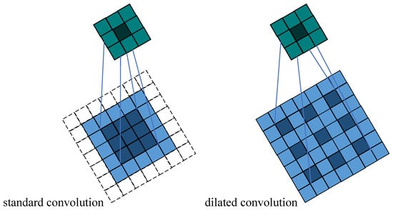 To mitigate the spatial resolution loss associated with using standard convolutional layers for processing CWT two-dimensional time–frequency images, this work employs dilated convolution. Dilated convolution expands the receptive field without sacrificing resolution. This is achieved by controlling the dilation rate, a key parameter of the dilated convolution operation. With different dilation rates being set, the receptive field size varies, enabling the extraction of multi-scale information from the input. Figure 1 depicts a schematic comparison between standard convolution and dilated convolution.