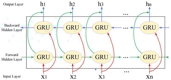 The bidirectional information flow mechanism inherent in the BiGRU model enhances its contextual awareness, allowing it to better understand and utilize long-range dependency information within lengthy sequences. Within a BiGRU neural network, each timestep employs two separate GRU units operating in parallel: one processes information from the sequence start to the current timestep (forward direction), while the other processes information from the current timestep to the sequence end (reverse direction). The outputs from these two GRU units are then combined to form the final output for each timestep. This architecture endows the BiGRU model with greater robustness and higher performance when processing long sequence data. The structure of the BiGRU is illustrated in Figure 2.