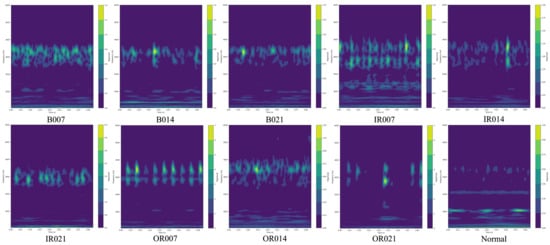 The continuous wavelet transform (CWT) [,] is a signal processing method that utilizes wavelet functions to analyze raw vibration signals and provides effective time and frequency information. CWT enables the observation of local features within vibration signals by adaptively scaling the wavelet to transform a one-dimensional vibration signal into a two-dimensional time–frequency image. Yang Xu et al. [] combined CWT with a hybrid deep learning model integrating CNN and gcForest classifiers; Ningkun Diao et al. [] integrated CWT with a residual neural network (T-ResNet); Guanwei Jia et al. [] input CWT time–frequency maps into a ResNet-18 network for fault signal identification and diagnosis; Yuan Guo et al. [] proposed a fault diagnosis method based on multi-resolution singular-value decomposition (MRSVD), continuous wavelet transform (CWT), an improved CNN enhanced with convolutional block attention modules, and long short-term memory (LSTM). All these approaches leverage the advantages of CWT to enhance feature extraction, thereby improving the accuracy of fault diagnosis. A key advantage of the CWT lies in its ability to automatically adjust the temporal resolution according to the frequency characteristics of the signal, thereby providing superior analysis results across different frequency ranges. In the high-frequency regions of a signal, CWT captures more transient features and finer details, while in the low-frequency regions, it provides a broader overview of the signal’s characteristics. The mathematical expression for the CWT is given in Equation (1):