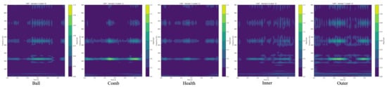 The multi-modal feature fusion bearing fault diagnosis model based on a dual-channel parallel structure proposed in this paper first converts the original one-dimensional vibration signals into two-dimensional time–frequency images with continuous wavelet transform (CWT). Then, both the one-dimensional vibration signals and the two-dimensional time–frequency images are input into the model. The data preprocessing is as follows: the original one-dimensional vibration signals of the bearing are segmented, with each sample set to a length of 1024 data points. Overlapping sampling is used for data augmentation, with an overlap length of 512 data points between consecutive samples. The height and width of the two-dimensional time–frequency images are set to , forming RGB color images with three color channels and a resolution of pixels. Following this step, the dataset is divided into training, validation, and testing subsets with a distribution of 60%, 20%, and 20% respectively. The resulting two-dimensional time–frequency visualizations for both categories of data post-CWT processing are illustrated in Figure 4 and Figure 5.