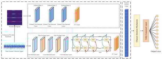 Building on this analysis, this paper proposes a dual-channel parallel multimodal feature fusion method for bearing fault diagnosis. The method first employs the continuous wavelet transform (CWT) to convert one-dimensional vibration signals into two-dimensional time–frequency images. Both the original one-dimensional vibration signal and the generated two-dimensional time–frequency image are then concurrently input into the proposed dual-channel parallel model. The first channel utilizes a 1DCNN combined with a BiGRU to extract temporal features from the one-dimensional vibration signal. The second channel employs a dilated convolution to extract spatio-temporal information from the CWT time-frequency image. Subsequently, the deep-level fault features extracted by both channels are fused within a feature fusion layer. Furthermore, to more comprehensively utilize the fault features, a channel attention mechanism is embedded after the fusion layer. This mechanism enables the network to focus more effectively on salient features within each channel and suppress interference from redundant features, thereby enhancing the performance and accuracy of the dual-channel network. Finally, the fused fault features are input into a softmax classifier for fault classification.