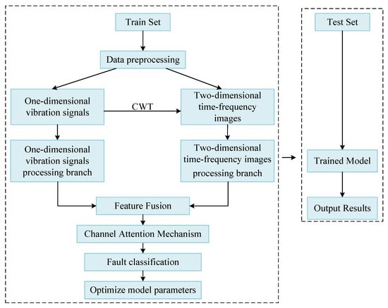 This paper proposes a multimodal feature fusion bearing fault diagnosis model based on a dual-channel parallel architecture. The schematic diagram of the proposed dual-channel parallel multimodal feature fusion bearing fault diagnosis model is presented in Figure 6. The network architecture parameters are shown in Table 1. The overall diagnostic approach operates as follows: First, one-dimensional vibration signals are transformed into two-dimensional time–frequency representations using the continuous wavelet transform (CWT). Subsequently, both the raw one-dimensional vibration signals and the generated two-dimensional time-frequency representations are fed simultaneously into the dual-channel parallel model.