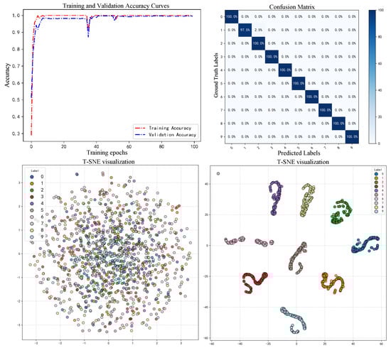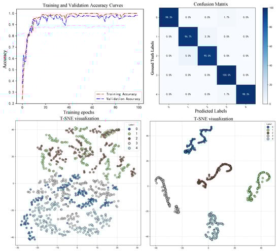 To offer a clearer understanding of the fault classification results, the accuracy variation curve, confusion matrix, and t-distributed stochastic neighbor embedding (t-SNE) visualization for the model’s performance on the SEU dataset for one of the experiments are also presented, as visualized in Figure 9.