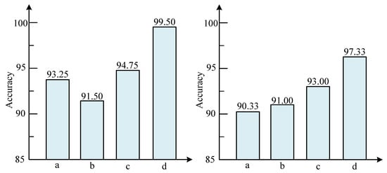Ablation experimental results on the CWRU dataset (left) and SEU dataset (right). (a) One-dimensional vibration signals were input into a one-dimensional convolutional neural network and a bidirectional gated recurrent unit. (b) Time–frequency images in two-dimension were processed using a dilated convolutional neural network. (c) Both the one-dimensional vibration signals and the two-dimensional time–frequency images were input into the model without channel attention weighting. (d) The proposed model in this study.