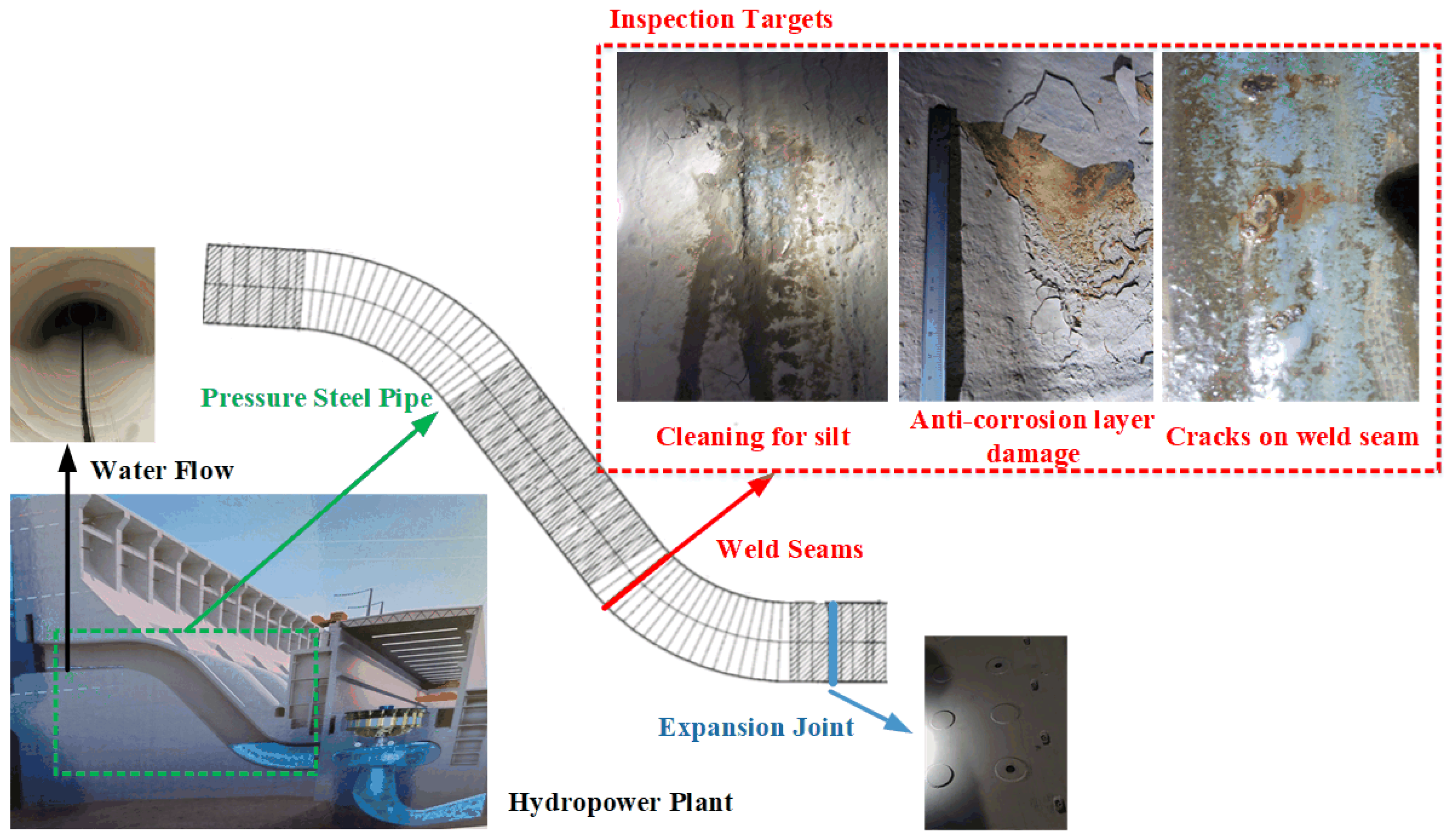 As a quality renewable energy generator, the safety operation of hydropower plants is crucial to social and economic development. The inlet pressure steel pipe is an important functional part of a hydropower generator unit. It is a large structural component that utilizes the pressure difference generated by the height to drive the water flow into the hydraulic turbine. The pressure steel pipe inspection mainly refers to the detection of anti-corrosion layer damage on the inner wall, surface, and internal cracks on the welding seam. Its specific process includes high-pressure water cleaning, surface visual inspection, and internal flaw detection. Traditional manual inspection has the disadvantages of low efficiency and high operational risk. Considering the magnetic conductivity of the pressure steel pipe, a novel non-contact magnetic climbing robot is proposed to complete the inspection tasks in this work.