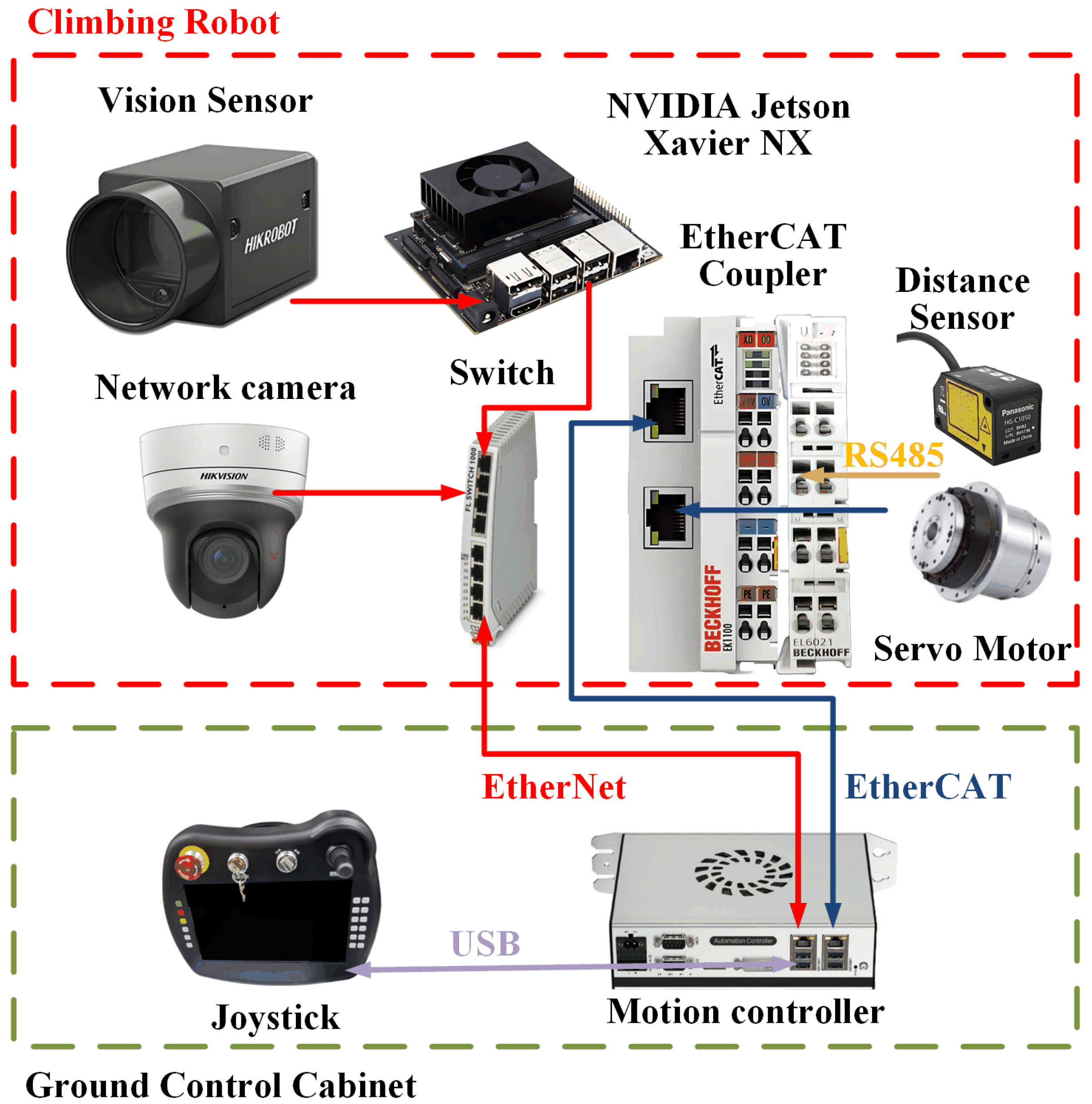 For the three inspection tasks, internal flaw detection requires high precision in the relative pose control between the climbing robot and the weld seam, which is also the purpose of weld seam recognition. The detection data is primarily collected and recorded by the PAUT detector. With technological advancements, the use of detectors with online identification capabilities may significantly enhance detection efficiency. In the surface anti-corrosion layer detection, the location and area of corrosion near the weld seam vary significantly, and the view field of the vision sensor cannot meet the requirements, so a network camera is used for image acquisition.