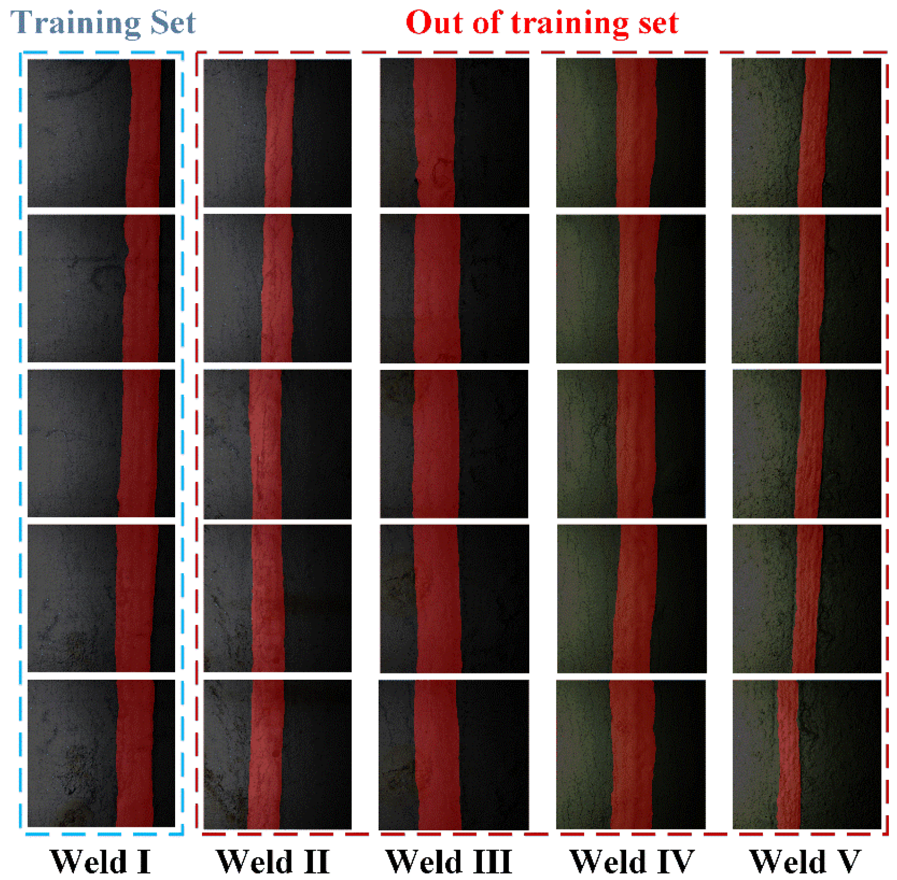 Figure 18. Given the wide variety of weld types, the semantic segmentation model needs to have a certain degree of generalization ability. Weld I in this test consists of images of different locations of welds in the training set, while welds II to V did not appear in the training set. The recognition results clearly show that the model has a certain degree of generalization ability and can still complete the recognition task with new welds. The mean intersection over union (