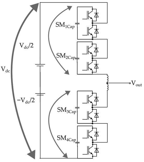In this work, a single-phase half-bridge MMC leg is considered as illustrated in Figure 3. Each arm is represented by the series connection of the inserted submodule capacitor voltages, an arm resistor, and an arm inductor. The midpoint between the upper and lower arms forms the AC terminal, while the converter is supplied by a common DC-link voltage .