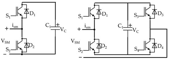 Figure 2 illustrates the structural difference between half-bridge and full-bridge SMs. The half-bridge offers reduced device count and higher efficiency but lacks inherent DC fault blocking capability. The full bridge provides fault blocking at the cost of additional components and higher losses. For the purposes of this work, the half-bridge MMC was selected, balancing simplicity, efficiency, and suitability for demonstrating the proposed balancing strategy.